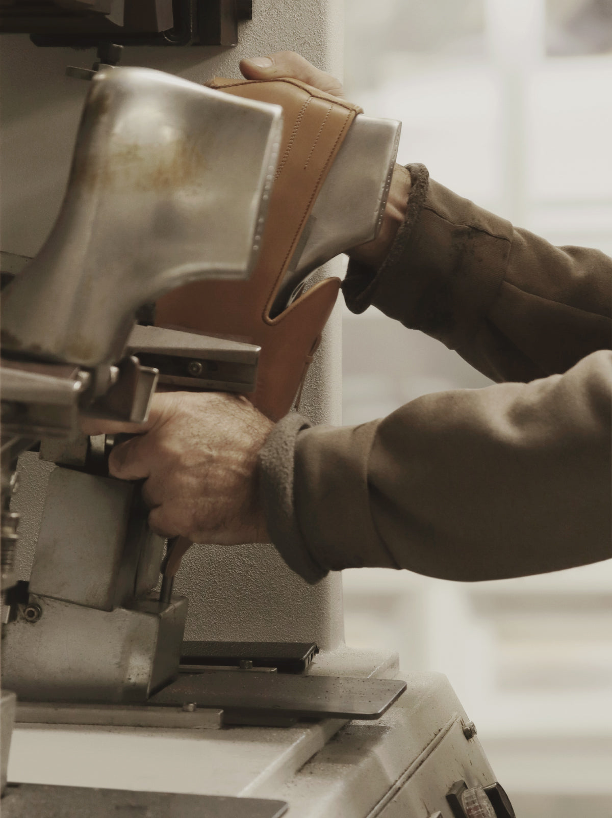 Raw leather soles and heels are trimmed and beveled to attain the ideal lines and thickness as requested by each customer. The leather is buffed and colored using non toxic pigments. Metal tacks are used to reinforce the toe and heels and to provide an elegant finish.