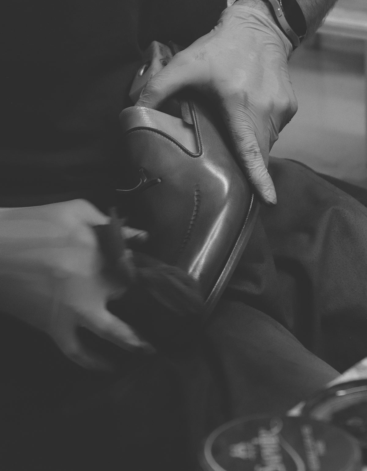 This may be one of the most distinguishing attributes of Di Bianco™ shoes. We use the finest polishes and colorants available in our hand polishing process. Di Bianco™ even hand polishes black calfskin. The burnishing of Di Bianco™ shoes is a very long and intensive process that often requires the use of numerous colors in combination to attain the final color. Di Bianco™ employs champagne to enhance the burnishing effect. Several colors offered are “Based on Black” whereby the shoe begins as black calfskin but through the removal of some of the pigmentation and the hand application of additional colors the end result is a smoky multi-layered finish.
